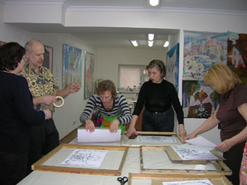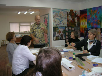 Занятия проводятся в форме мастер-классов: мастер показывает технический прием, ученики повторяют. Каждый мастер-класс посвящен различным техническим приемам. На занятии учащиеся получают полную информацию о технике и расписывают работу в материале: станковое панно, платок, шарф, палантин.