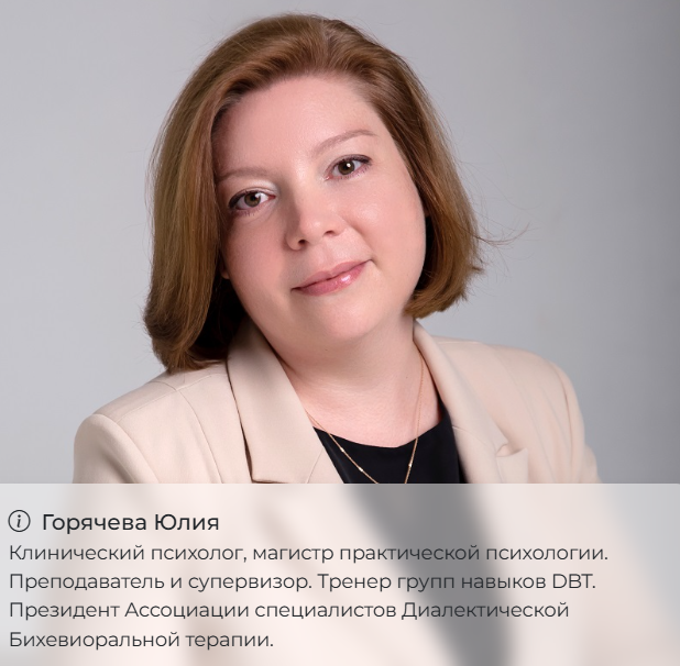 Горячева Юлия - Клинический психолог, магистр практической психологии. Преподаватель и супервизор. Тренер групп навыков DBT. Президент Ассоциации специалистов Диалектической Бихевиоральной терапии.