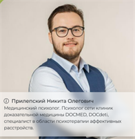 Прилепский Никита Олегович - медицинский психолог. Психолог сети клиник доказательной медицины DOCMED, DOCdeti, специалист в области психотерапии аффективных расстройств.